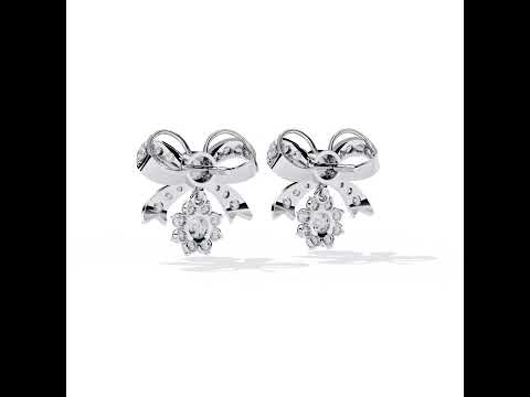 These exquisite earrings feature a graceful bow-inspired design embellished with dazzling round-cut diamonds. The elegant curves are lined with sparkling stones, leading to a charming dangling diamond cluster that enhances brilliance and movement. Crafted for a luxurious yet feminine appeal, these earrings are perfect for weddings, festive celebrations, and evening events. Their refined detailing and radiant shine make them a statement accessory, adding timeless sophistication and glamour to any outfit.