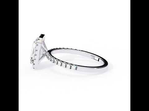 This exquisite ring showcases a brilliant emerald-cut center diamond that radiates timeless elegance and clarity. A sparkling halo of smaller diamonds enhances the center stone, adding extra brilliance and luxurious appeal. Crafted in a beautiful rose gold setting, it offers a warm and romantic touch. The delicate band is adorned with shimmering accent stones for added sparkle from every angle. Its classic yet modern design makes it perfect for engagements, anniversaries, or special celebrations. A sophisticated statement piece that combines craftsmanship, beauty, and lasting style.