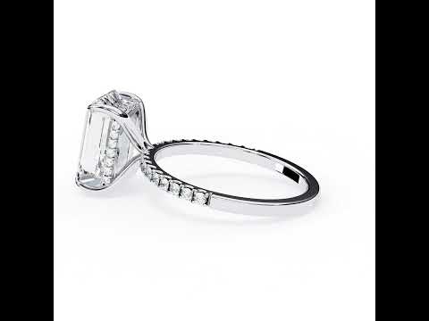 Elegant emerald-cut diamond ring showcasing a stunning, elongated center stone with exceptional clarity and brilliance. The classic four-prong setting enhances light reflection while keeping the design refined and timeless. A delicate rose gold pave band adds subtle sparkle and a romantic, modern touch. Clean lines and balanced proportions make it perfect for engagements or special occasions. Designed to combine luxury, sophistication, and everyday elegance.